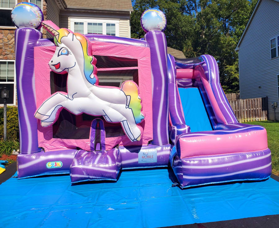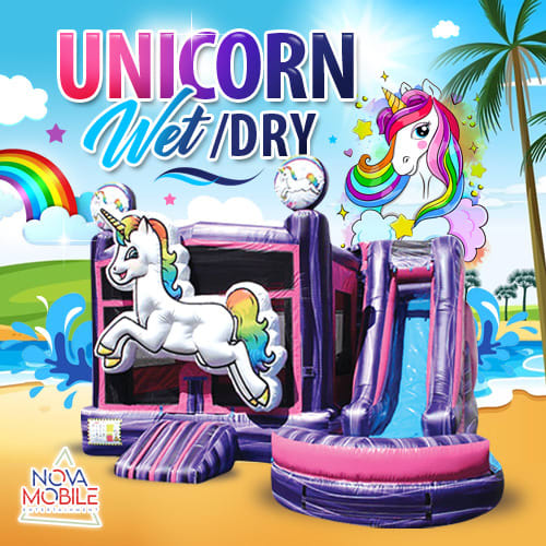 Enjoy our Unicorn Wet/Dry Inflatable. The kids will love this bouncer. Inside they will bounce and play with its basketball hoop. Then climb the ladder outdoors and slide down the slippery water slide.