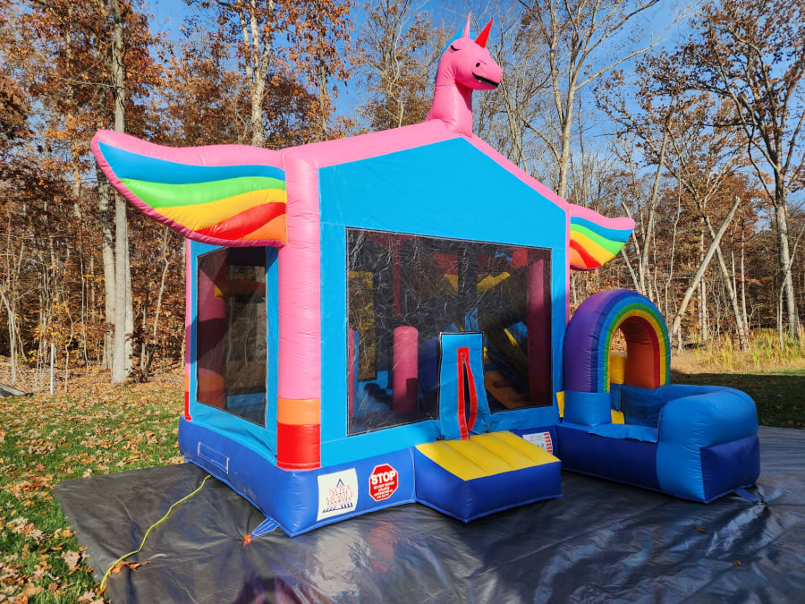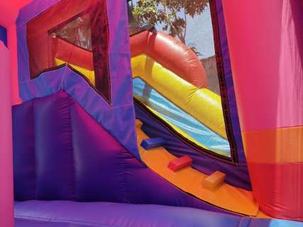 Enjoy our Pink Unicorn Wet/Dry Combo Inflatable. The kids will love this bouncer. Inside they will bounce and play with its basketball hoop. Then climb the ladder outdoors and slide down the slippery water slide. C