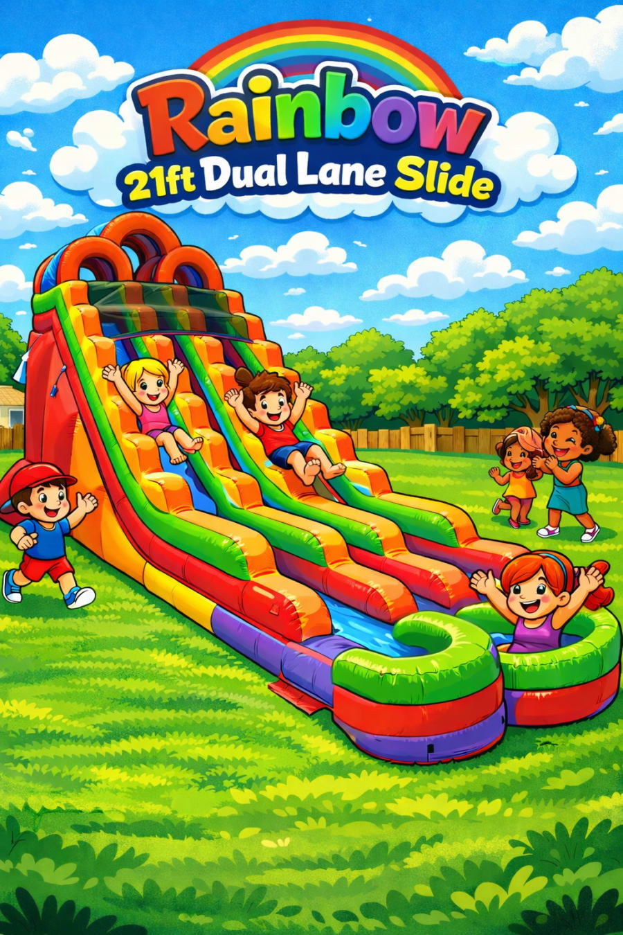 The Rainbow 21ft Dual Lane Slide delivers high-energy thrills for parties and events. Quick thrills. Safe design. Eye-catching rainbow colors draw crowds. Fun slide perfect for schools, churches, carnivals and festivals — a top pick for every age. Kids race side-by-side on two lanes for nonstop excitement. 🎈