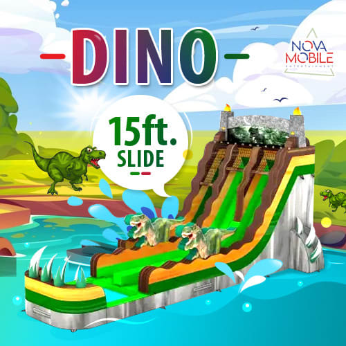 The 15 foot Dino Slide is a great slide for summer fun. The kids climb to the top of the slide and cool off as they splash into the giant pool.