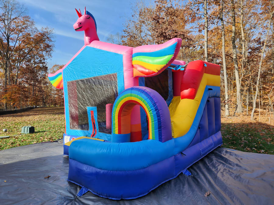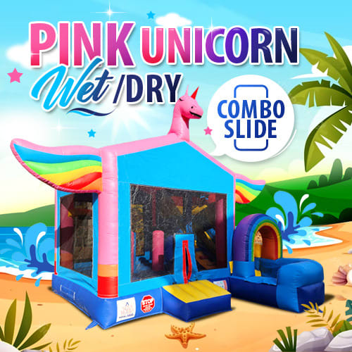 Enjoy our Pink Unicorn Wet/Dry Combo Inflatable. The kids will love this bouncer. Inside they will bounce and play with its basketball hoop. Then climb the ladder outdoors and slide down the slippery water slide. C
